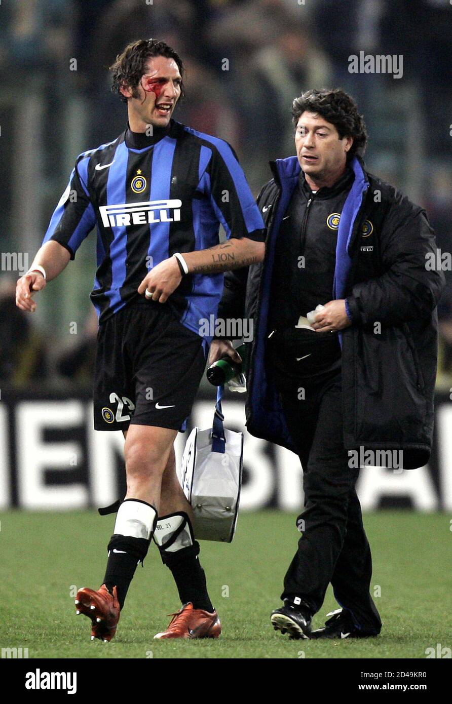 Marco Materazzi Von Inter Mailand Verlasst Das Spielfeld Nachdem Er Von Einem Inter Mailand Beamten Wahrend Ihres Serie A Spiels Gegen Lazio Im Olympiastadion In Rom 12 Marz 2005 Verletzt Wurde Das Spiel Endete Mit